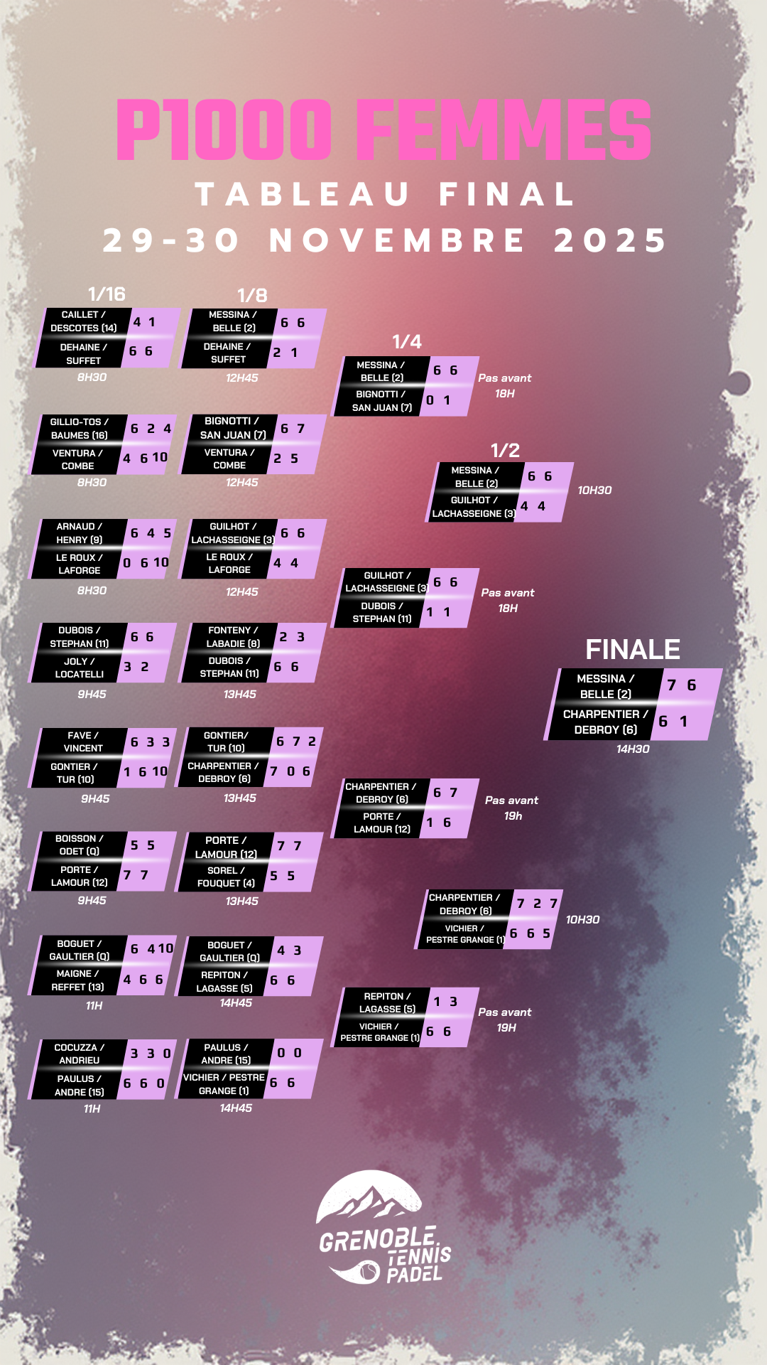 Un grand bravo à Chiara Messina et Alexandra Belle, qui remportent ce P1000 sans avoir concédé un seul set, mais également à la jeune paire Charpentier / Debroy, pour leur parcours impressionnant et leur courage face aux favorites.
